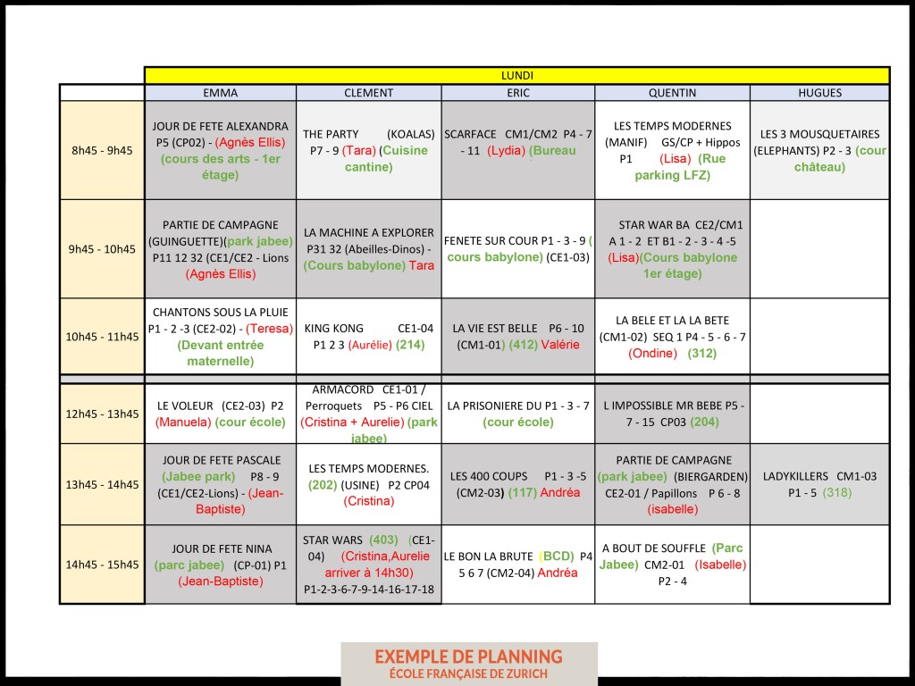 Dans les conditions d’un tournage professionnel de cinéma (la séquence 3 peut être tournée avant la séquence 1), un planning très strict est appliqué avec un minimum de 1 heure de tournage par jour par classe.